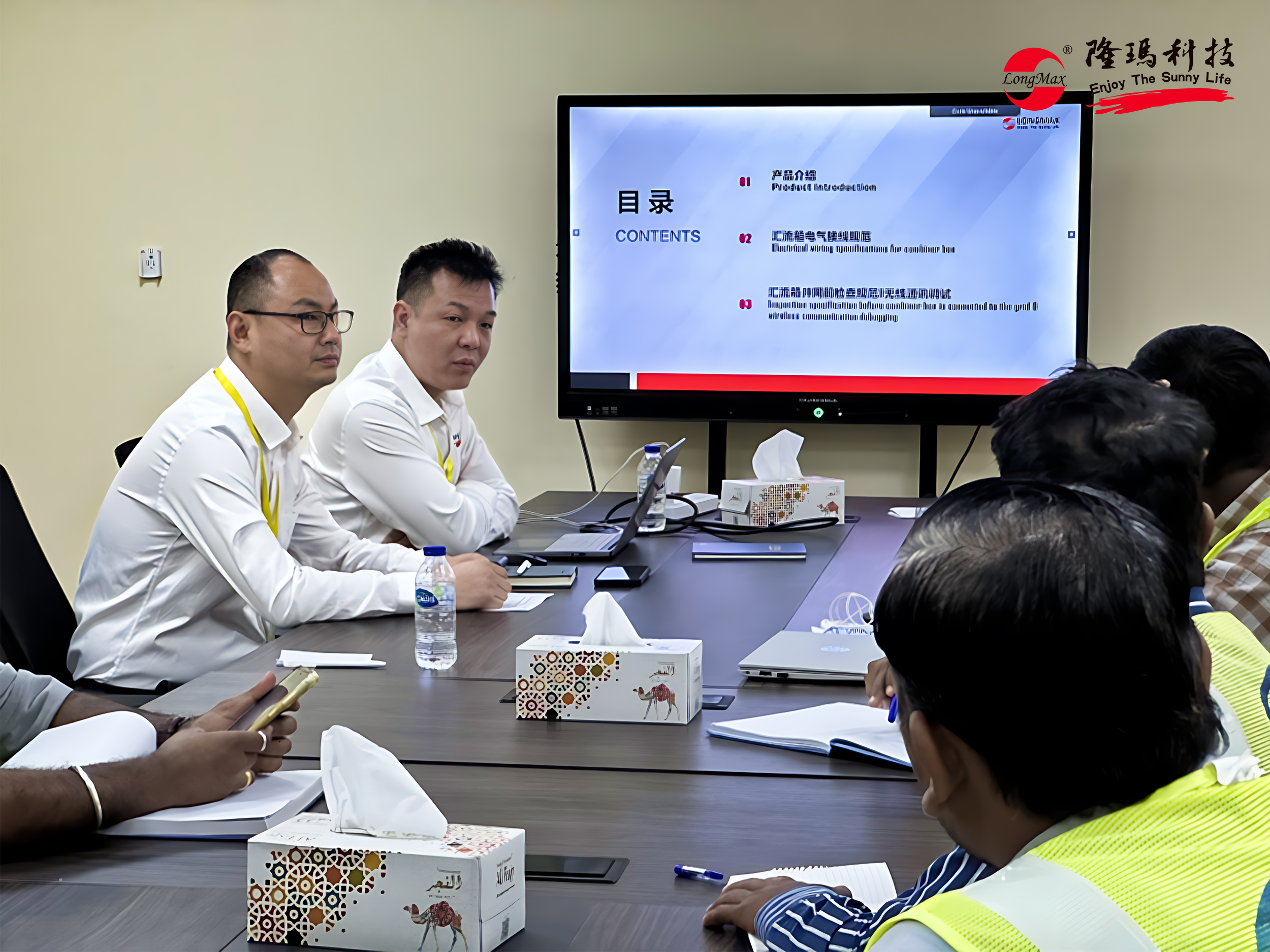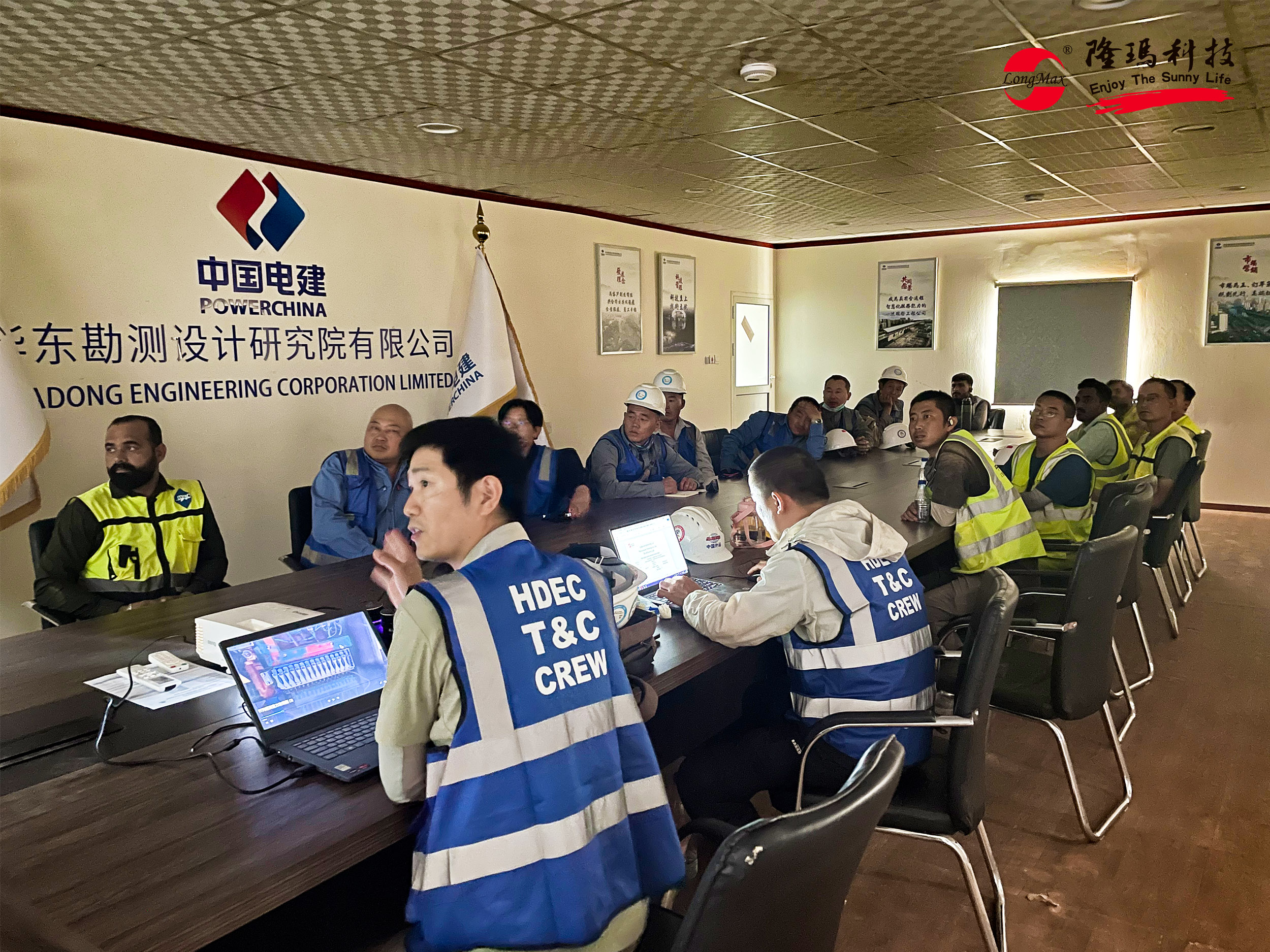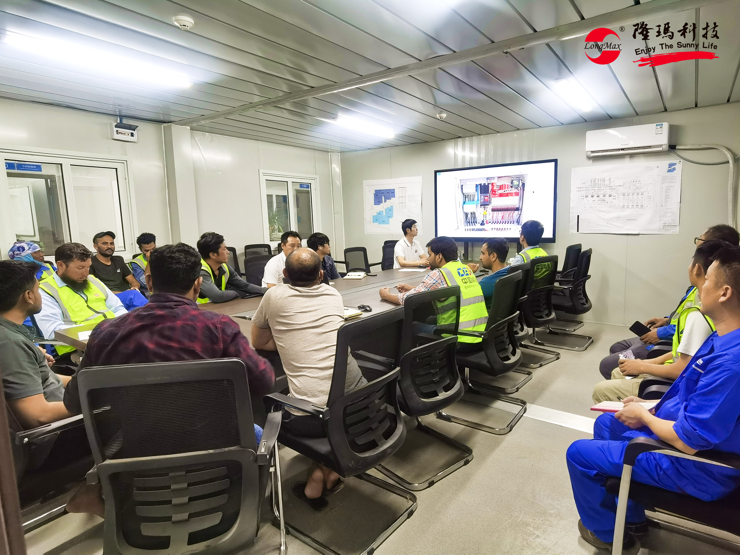 沙特AL MUWAYH 2000 MW 項目深處沙漠腹地。在項目關鍵節點,隆瑪科技團隊迎戰極端高溫,迅速響應。憑借豐富的實戰經驗與深厚的專業素養,團隊一天內高效完成并網前檢查要點及注意事項的專項精訓,為項目順利推進與關鍵節點達成奠定堅實技術基石。