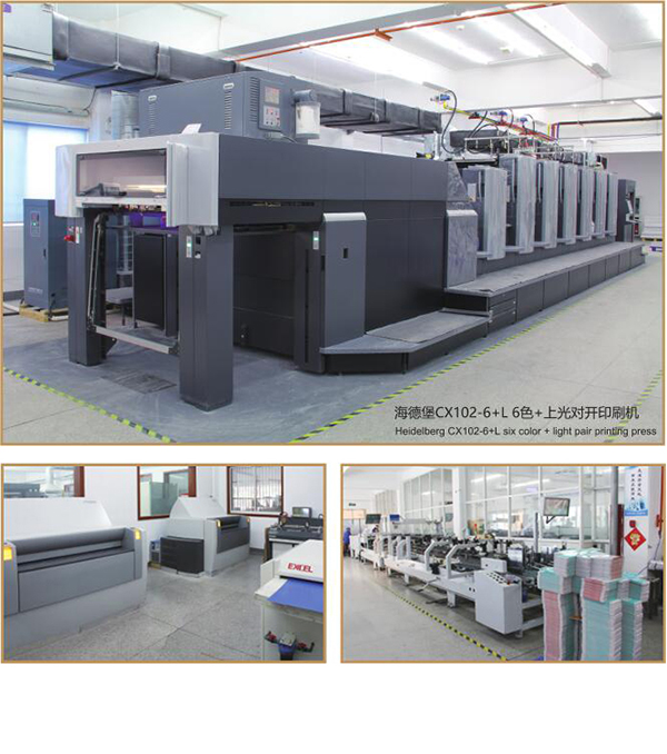 印刷設備:先進的德國高寶RAPIDA106高配置小全張彩色印刷機、日本小森A37、筱原92機、日本小森LS429小對開彩色印刷機、大族冠華GH564正四開彩色印刷機、奧西2110數碼印刷機、中基彩虹聯單自動配頁印刷機。